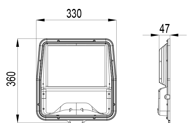 - 120W – 150W: 360x330x47 mm,
