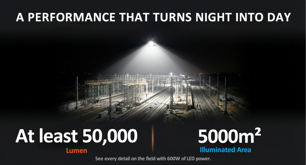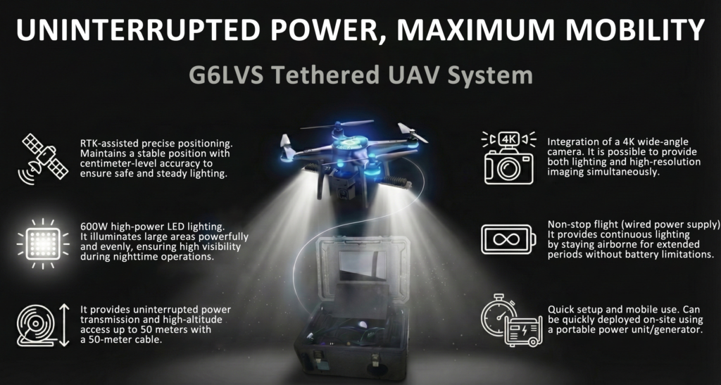 The 600W lighting capability makes it easier to scan large areas. Under the drone, there are 3 sets of LED lighting modules, 2 of which can be directed to the desired area via remote control. With the G6LVS, you can safely operate at heights ranging from 5 meters to 50 meters. The maximum flight height is 50 meters due to the power cable.
