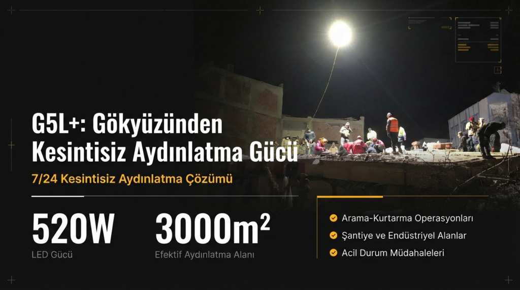 Jandarma trafik şarampole yuvarlanan aracın enkazının arama kurtarma faaliyetleri için arazi aracının arkasında taşımak isterken, raydan çıkmış bir trenin/vagonun durumunun tespiti için; demiryolu bakımını yapan ekip cihazın sırtta taşınmasını istemektedir. Polis arama kurtarma ekipleri de deniz nehir veya gölete düşen araç veya insan için sırtta taşıma opsiyonu istemektedir. Bu tip ihtiyaçlardan hareketle G3L modelini modifiye edilerek sırtta taşınabilir ve yağmurdan etkilenmeyecek tasarım olan G5L+ modeline dönüştürülmüş ve piyasa sürülmüştür. 900W güç ünitesi ve 520W LED aydınlatma modülü mevcuttur.
