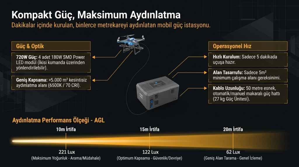 Aydınlatma fonksiyonlu İHA’ların endüstride kullanımı oldukça yaygındır. Askeri sektörden, güvenlik güçlerine ve hatta arama kurtarma faaliyetlerine kadar çeşitli alanlarda 7/24 kesintisiz kullanılması planlanmaktadır. Daha geniş alanların aydınlatılması ve daha yüksek irtifa isteklerine karşılık olarak G5L modelinden hareketle G6LS modeli çıkarılmıştır. G6LS modeli ile 5metreden 50metreye kadar değişen irtifada sorunsuz ve kesintisiz uçuş yapabilirsiniz. Maksimum uçuş yüksekliği, güç kablosu nedeniyle 50metredir.