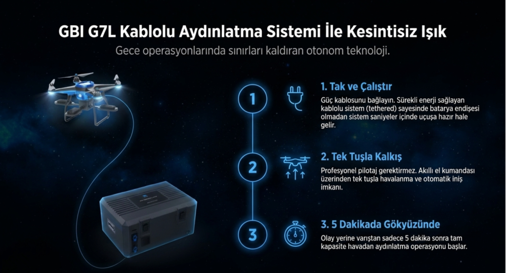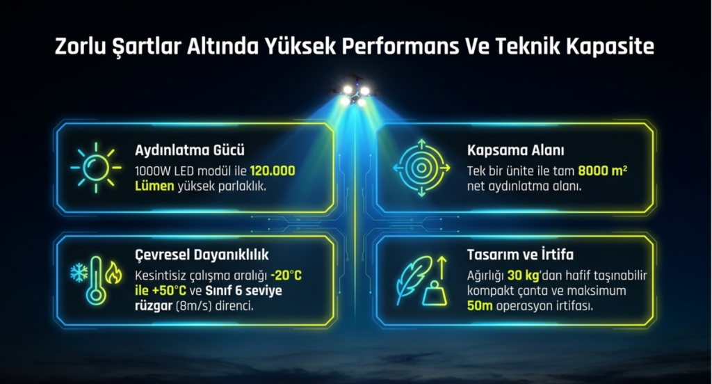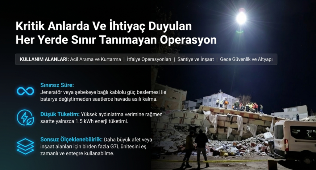 Jandarma trafik ekiplerinin şarampole yuvarlanan araç enkazındaki arama kurtarma faaliyetleri, demiryolu bakım ekiplerinin raydan çıkan vagonların durum tespiti veya polis ekiplerinin su kenarlarındaki operasyonları için sistemin kolay taşınabilir olması kritik önemdedir. Bu tip ihtiyaçlar doğrultusunda geliştirilen ve tüm ekipman ağırlığı 30 kg’ın altında olan G7L modeli, Seviye 10 yağmur direnci ve Sınıf 6 rüzgar dayanımı ile zorlu hava koşullarından etkilenmeyecek şekilde tasarlanmıştır. Sistem, kesintisiz güç kaynağı sayesinde havada uzun süre asılı kalabilen 1000W LED ışık grubuna sahiptir ve 120.000 lümen değerinde yüksek parlaklık sağlar.