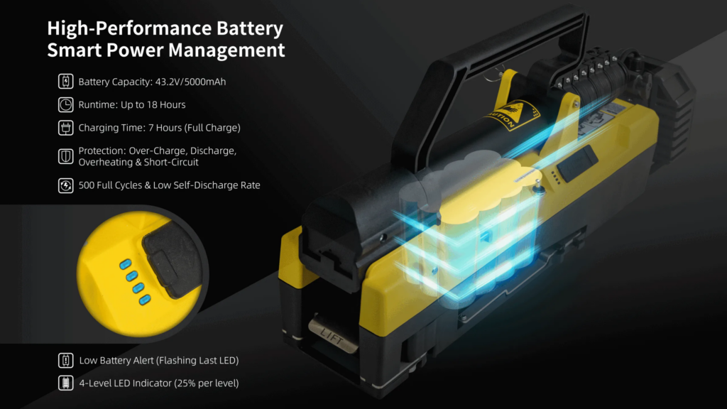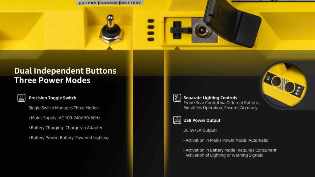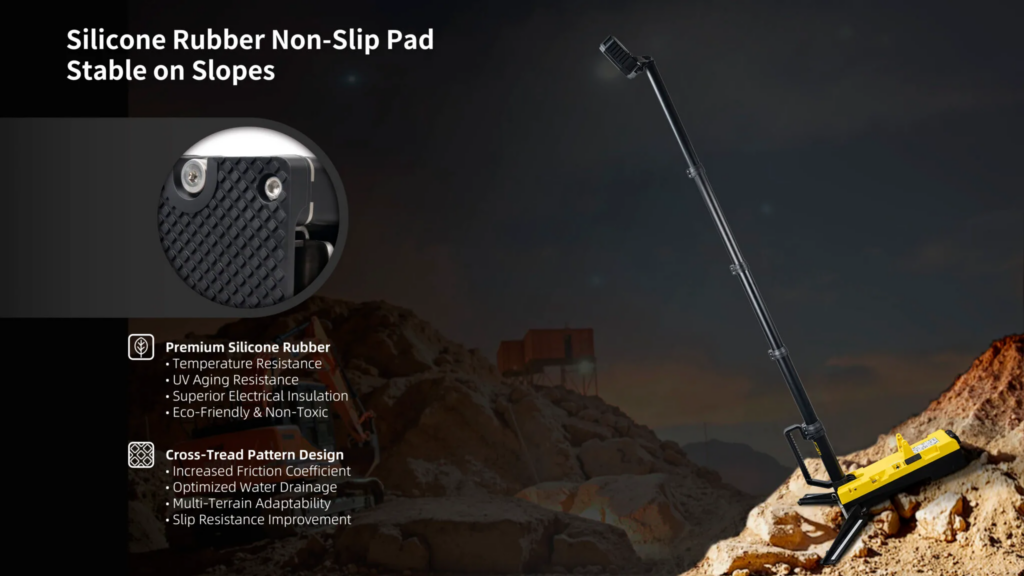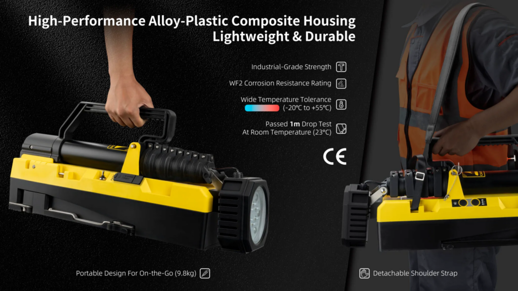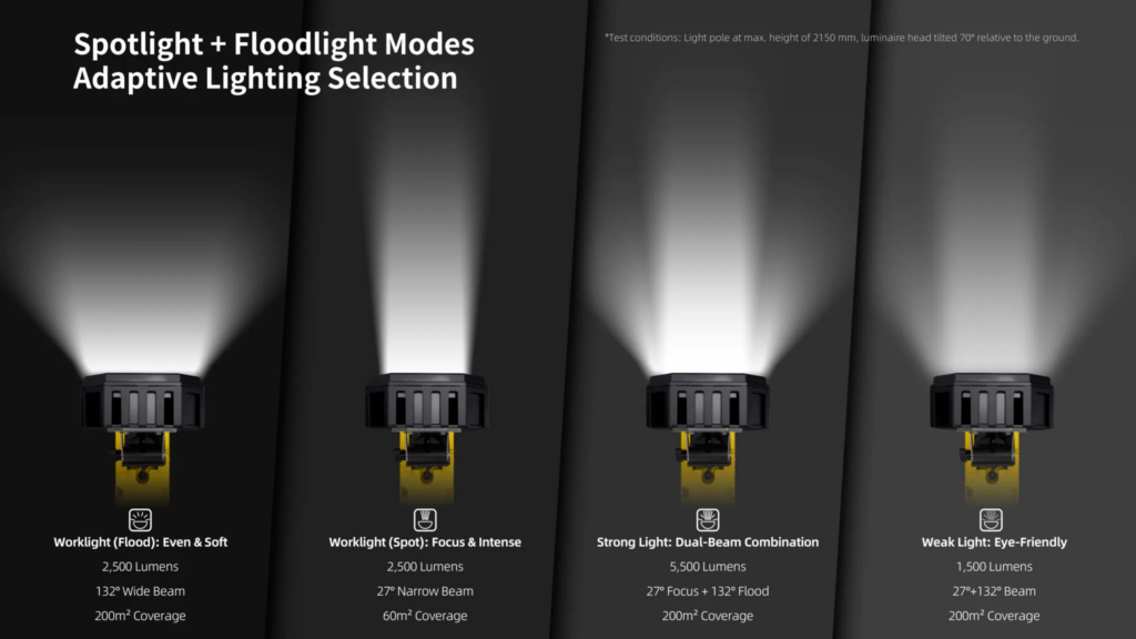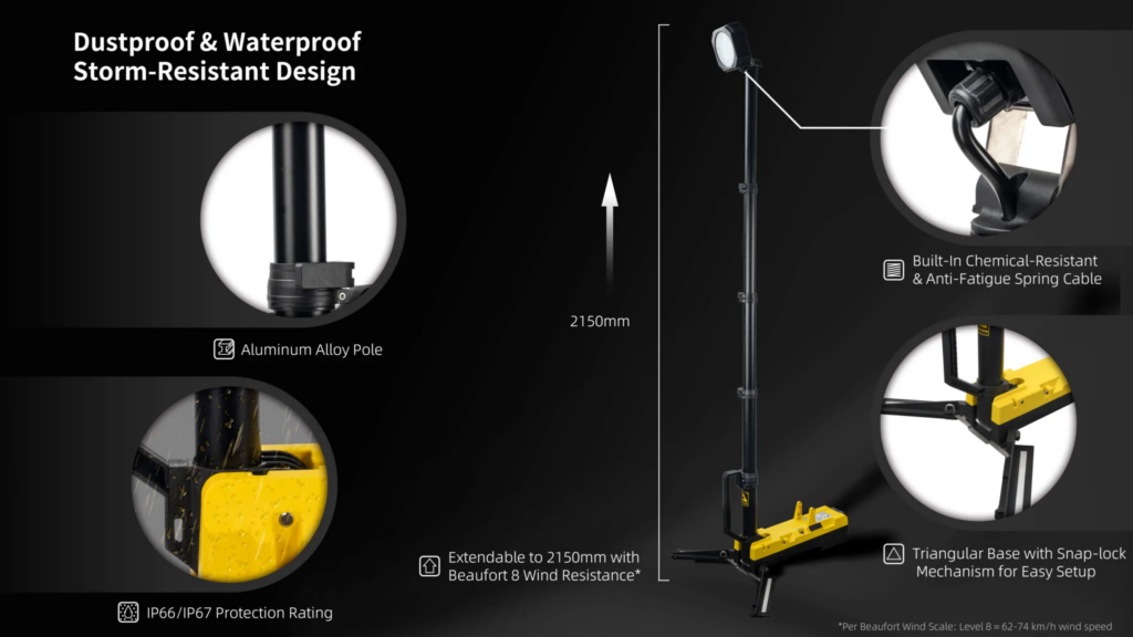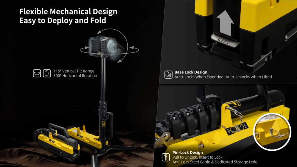 En ulaşılması zor yerlere ışık tutmak için yatay ve dikey olarak dönebilen boynu ile öne çıkıyor. Stabilizasyon ayakları tamamen açıldığında ve saniyeler içinde kilitlendiğinde tam yüksekliği 2150 mm’ye kadar uzatılabilir, böylece aydınlatma alanı artırılır ve bölgesel aydınlatma işlevi sağlanır.